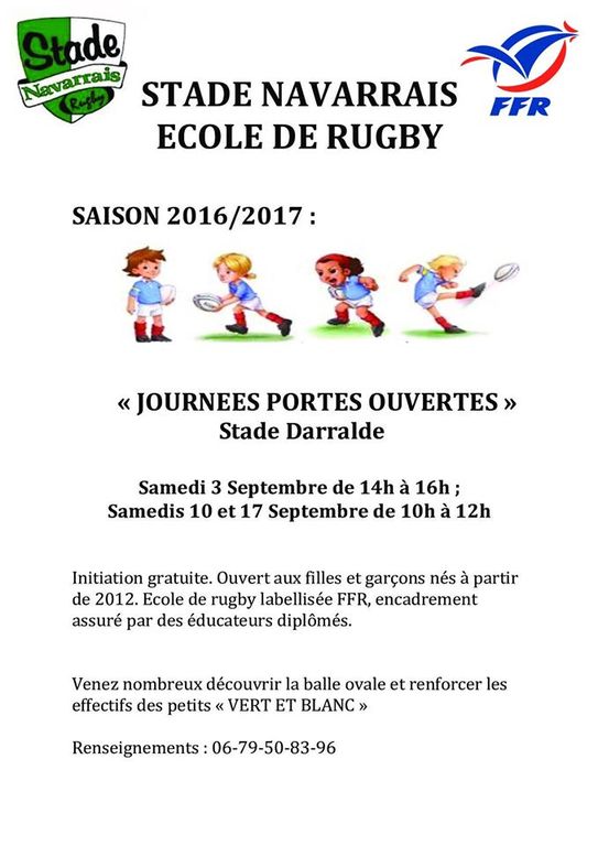 - samedi 3 septembre 2016, reprise générale pour toute l'école de rugby à 14h