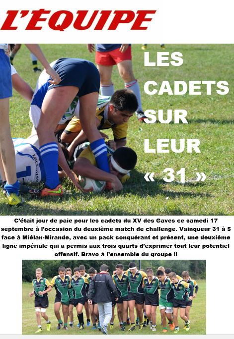 C’était jour de paie pour les cadets du XV des Gaves ce samedi 17 septembre à l’occasion du deuxième match de challenge. Vainqueur 31 à 5 face à Miélan-Mirande, avec un pack conquérant et présent, une deuxième ligne impériale qui a permis aux trois quarts d’exprimer tout leur potentiel offensif. Bravo à l’ensemble du groupe !!