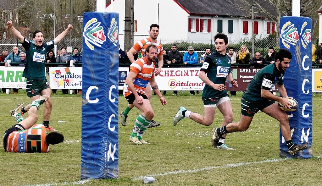 e Stade Navarrais tombe le leader Stade Navarrais 33 Aramits 22 Grosse performance des Navarrais à domicile face au leader Aramits qui a démontré sur le terrain que sa première place n’était pas usurpée. Mais le Stade Navarrais a su dès la première mi-temps concrétiser ses phases de conquêtes avec deux essais, Puis en assurant le score avec un autre essai en deuxième mi-temps. Les visiteurs finissant très fort le match, les Verts ont vaillamment résisté afin de préserver l’essentiel : UNE TRES BELLE VICTOIRE A L’ISSUE D’UN TRES BEAU MATCH FELICITATIONS ET BRAVO LES GARS !!